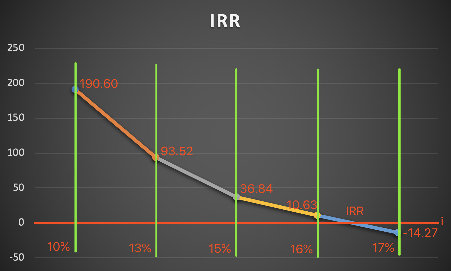 IRR = (IRR-16%) ➗ (17%-IRR) = 10.63 ➗ 14.27